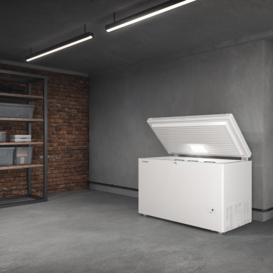 The CFe 2500 chest freezer offers 497 litres of storage with FrostProtect and ultra-quiet performance, dependable freezing even in garages, garden offices, or basements.