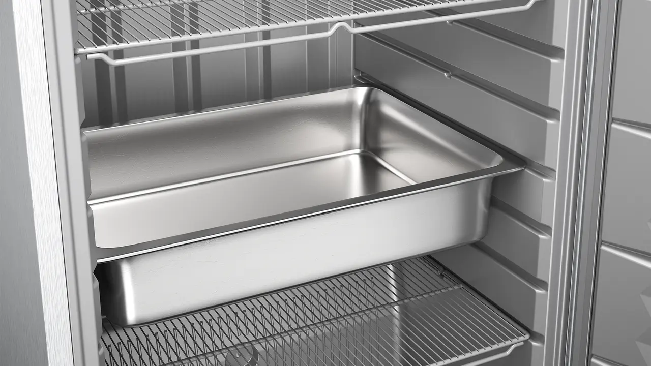 Мощен и ефективен: динамичната система за охлаждане на този хладилник за хранително-вкусовата промишленост гарантира стабилни и равномерно разпределени вътрешни температури – и използва много малко енергия за целта. Контактният прекъсвач на вратата за вентилатора минимизира загубата на студ при отваряне на вратата. Благодарение на изпарителя системата почти не изисква поддръжка.