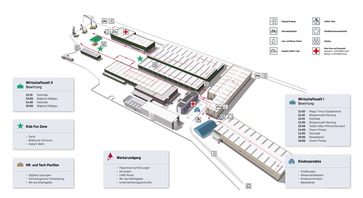Der Werksrundgang ist durch ein Leitsystem gekennzeichnet, aber nicht geführt. Bleiben Sie bei der Werksbesichtigung immer innerhalb des beschilderten Rundganges. Die Liebherr Mitarbeiter machen Sie auf Betriebsgefahren aufmerksam und informieren Sie, wie Sie sich im Notfall verhalten müssen.