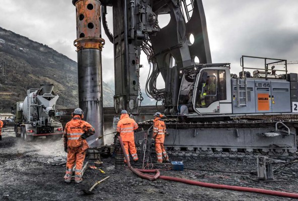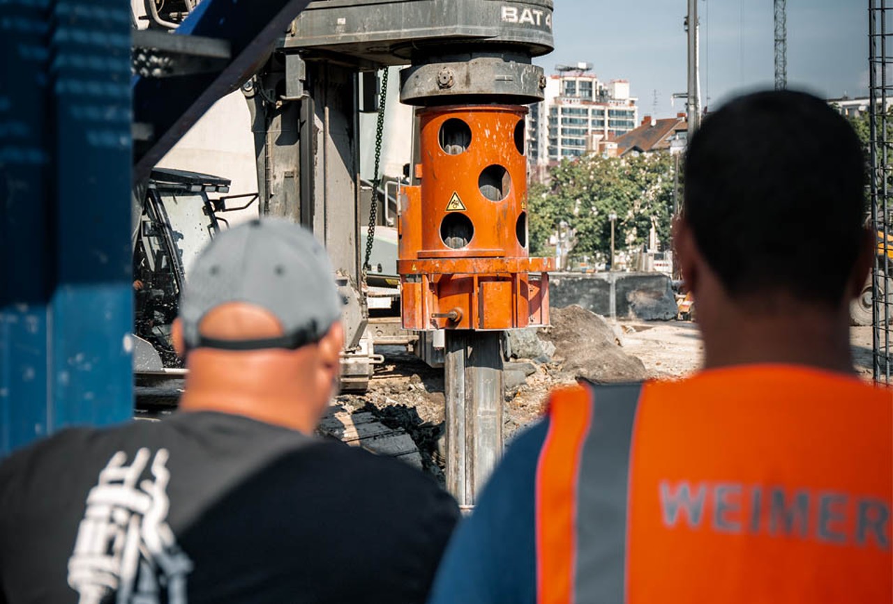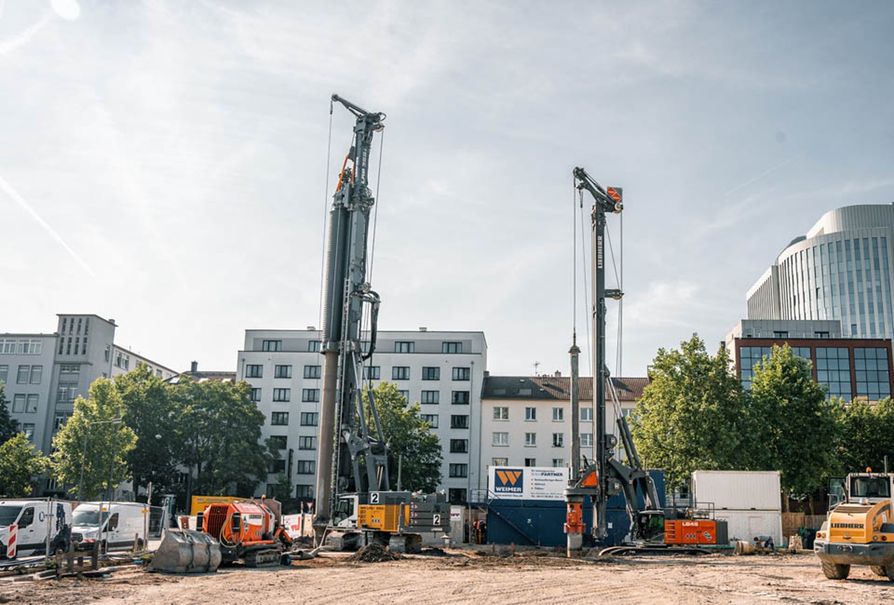 Mitten in Frankfurt realisiert die Bauwens-Gruppe das zukunftsweisende Stadtentwicklungsprojekt „Hellerhöfe“ auf einer Fläche von rund 7.100 m² im dicht bebauten Frankfurter Stadtteil Gallus. Auf dem ehemaligen FAZ-Areal entstehen über 540 Mietwohnungen, ein Holz-Hybrid-Hochhaus, Büroflächen, Kitas und eine Grundschule. Die technische Grundlage für das nachhaltige Bauvorhaben schafft die Pfahlgründung mit Liebherr-Spezialtiefbaumaschinen: Im Einsatz sind unter anderem die Liebherr Bohrgeräte LB 30, LB 45 sowie das Ramm- und Bohrgerät LRB 355.1 – sie ermöglichen hohe Tagesleistungen trotz herausfordernder Bodenverhältnisse. Der Baugrund ist extrem heterogen, durchzogen von Kalksteinbänken – eine anspruchsvolle Aufgabe für den Spezialtiefbau. Beauftragt mit der Ausführung der Pfahlgründung ist die Kirchner GmbH Spezialtiefbau, im Auftrag der Weimer GmbH und des Generalunternehmers Lupp.