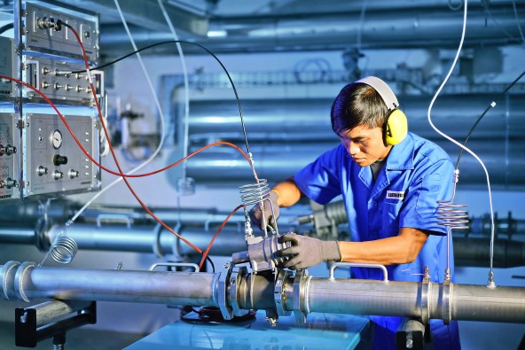 Ein Mitarbeiter des Liebherr-eigenen Servicezentrums in Singapur prüft ein Hochdruckklimaventil nach erfolgter Überholung.
