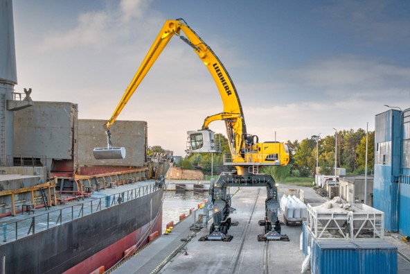 Hohe Traglasten bei gleichzeitig großen Reichweiten: Die Liebherr-Materialumschlagmaschine LH 150 M Gantry Port E überzeugt im Hafenumschlag von Schütt- und Stückgütern.