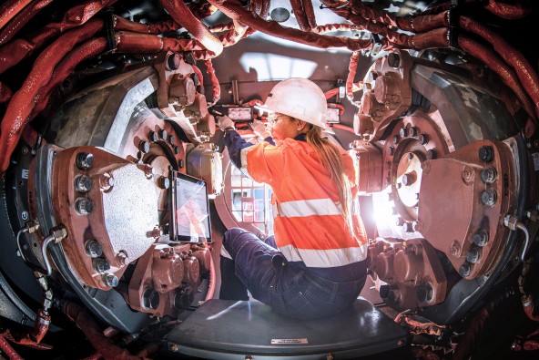Eine Liebherr-Servicespezialistin arbeitet am Muldenkipper T 264, damit die Maschine während ihrer gesamten Nutzungsdauer optimal funktioniert.