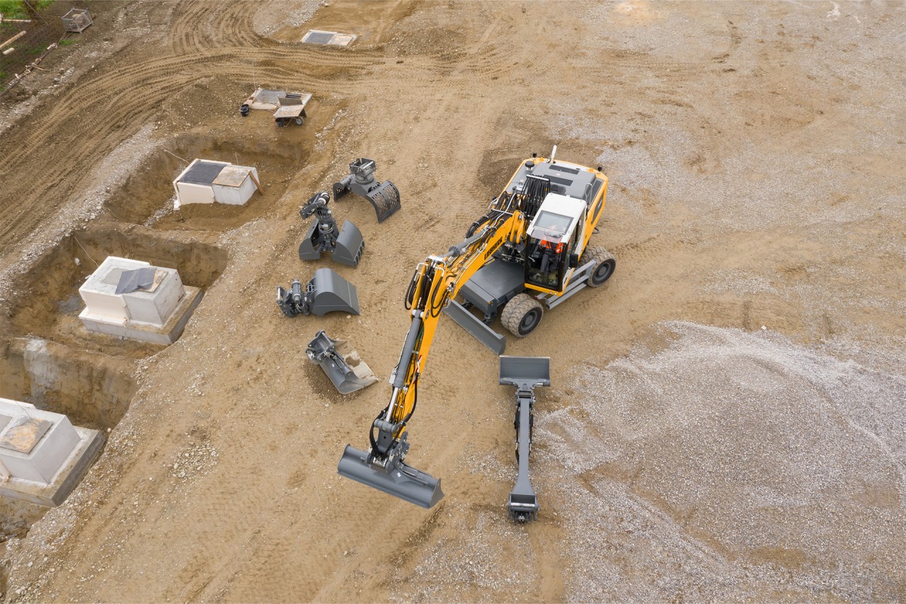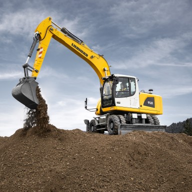 Der vielseitig einsetzbare Mobilbagger A 918 von Liebherr kommt insbesondere auf städtischen Baustellen und im Landschaftsbau zum Einsatz. Seine leistungsstarken Hydraulikzylinder ermöglichen präzise Bewegungen im Dauereinsatz.
