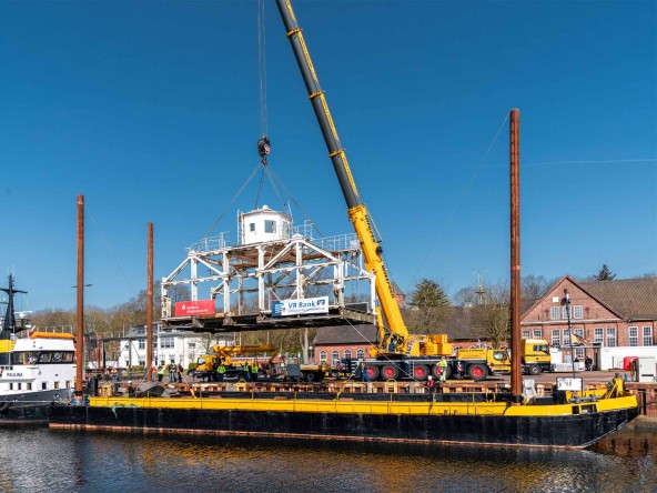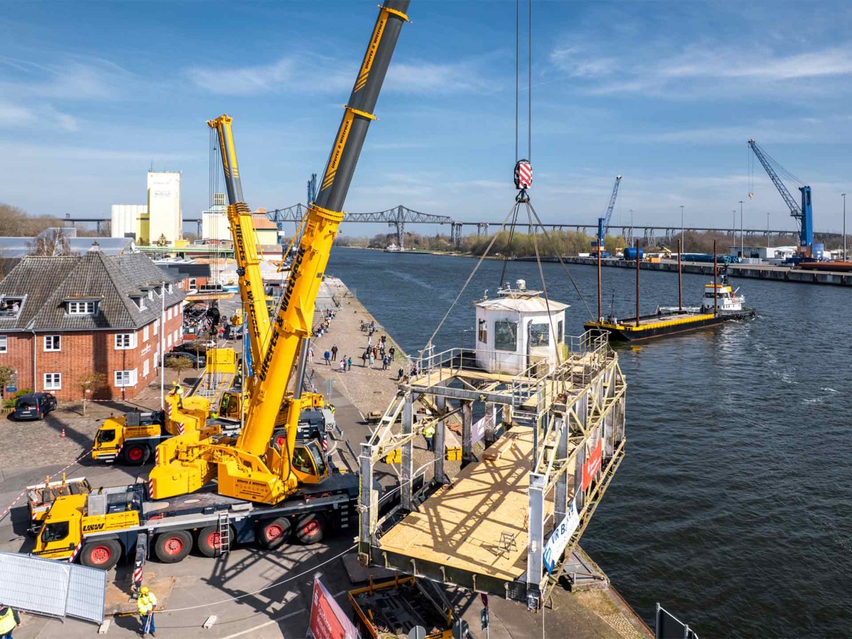 Neun Jahre lag sie auf dem Werftgelände des Wasserstraßen- und Schifffahrtsamtes und war eigentlich schon zur Verschrottung vorgesehen. Jetzt wurde die Original-Gondel der Rendsburger Schwebefähre zu neuem Leben erweckt. Dazu waren 15 Mann der Kieler Niederlassung des Kranunternehmens Ulferts & Wittrock – unter ihnen Betriebsleiter Michael Kulbe – mit Transportfahrzeugen und Mobilkranen nach Rendsburg gekommen. „Drei Monate Planung“, so Kulbe, „sind diesem Einsatz vorausgegangen. Aufgrund der Vorgabe, den gesamten Umzug auf Tieflader und Schiff mit den dafür erforderlichen vier Kranhüben innerhalb von nur neun Stunden durchzuführen, sind wir mit ausreichend Personal nach Rendsburg gekommen.“