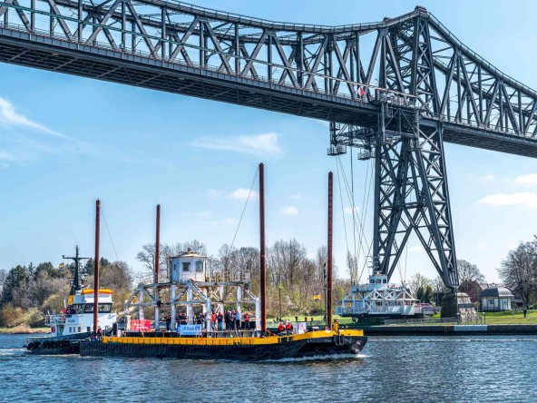 Abgefahren: Vorbei an der alten Wirkungsstätte der Gondel durchquert der Schubverband die Rendsburger Hochbrücke. Dieses außergewöhnliche Denkmal hoher Ingenieurbaukunst ist eine der längsten Eisenbahnbrücken Deutschlands.