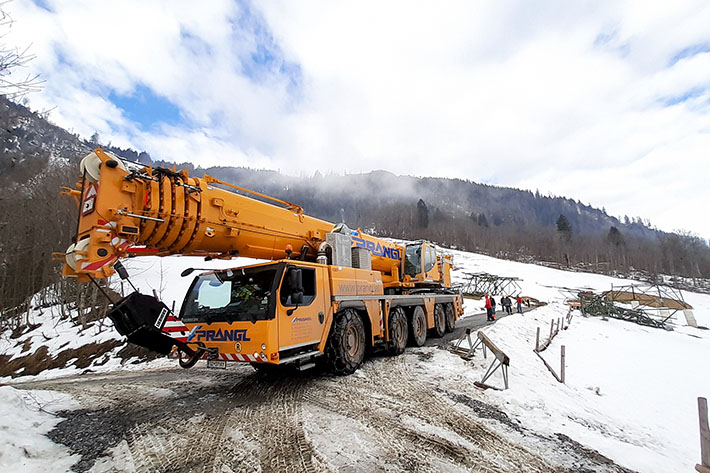 Noch oft werden also auf den manchmal unbefestigten Fahrwegen die gelben Krane von Prangl bis zur Baumgrenze emporfahren. Die 1965 als Familienbetrieb gegründete Prangl GmbH mit heute knapp 700 Mitarbeitern ist außer an sechs österreichischen Standorten auch in Ungarn, Slowenien, Kroatien, Bosnien und Herzegowina sowie Schweden mit Büros und Niederlassungen vertreten. Im großen Fuhrpark des auf Schwerlast-, Transport- und Hebelogistik spezialisierten Unternehmens finden sich über 80 Mobilkrane der Marke Liebherr.