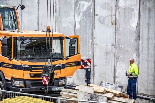 Ein wichtiger Faktor für das erfolgreiche Positionieren der Arbeitsbühne war die gute Kommunikation zwischen Kranfahrer und Einweiser. Da Uwe Kreuzberger an den Steuerhebeln in der Krankabine die Last nach dem Verschwinden hinter der Betonwand nicht mehr sehen konnte, musste er sich blind auf die Kommandos von Carsten Herfurth am Sprechfunkgerät verlassen.