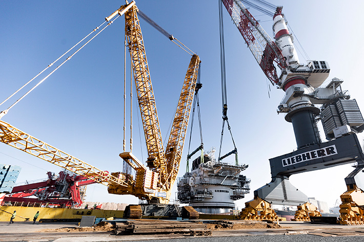 Nach ihrer Ankunft in China werden die Drehbühne und der A-Bock als erste Krankompenenten auf dem Offshore-Installationsschiff Alfa Lift von OHT montiert. Der Tandemhub der beiden Großkomponenten wurde am Liebherr-Standort in Rostock mit zwei leistungsstarken Liebherr-Kranen realisiert: Dem Raupenkran LR 11350 und dem TCC 78000, womit erneut die Relevanz des schienengebundenen Schwerlast-Portalkrans am Standort Rostock demonstriert wurde. Da der Tandem-Hub direkt an der Kaikante stattfand, konnte das Transportschiff seine Reise auf kürzestem Weg zur Ostsee antreten. Die Drehbühne und der A-Bock werden in der Werft von China Merchants Heavy Industry (CMHI) in der Provinz Jiangsu, nahe Shanghai, auf der Alfa Lift installiert. Wenn die Montage der beiden Komponenten abgeschlossen ist, wird der Ausleger passend „just-in-time“ geliefert, um den HLC 150000 fertig zu stellen.