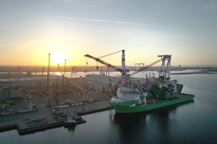 Nachdem das Schiff am 27. März den Rostocker Hafen verlassen hat, fand Ende letzter Woche im niederländischen Vlissingen die Schiffstaufe statt. Die traditionelle Schiffstaufe nahm Frau Amélie Michel, Gattin des Präsidenten des Europäischen Rates, Charles Michel, vor. Unter den mehreren hundert Anwesenden waren von der DEME Gruppe CEO Luc Vandenbulcke und DEME-Chairman Luc Bertrand anwesend. Zudem nahmen Patricia Rüf, Mitglied des Verwaltungsrats der Liebherr-International AG sowie Leopold Berthold, Geschäftsführer der Liebherr-MCCtec GmbH an den Feierlichkeiten teil.