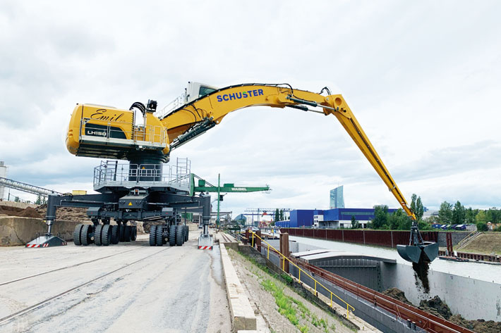 Der Frankfurter Osthafen hat eine signifikante Bedeutung für die urbane Bauwirtschaft. Als trimodaler Standort verbindet er die Verkehrsträger Wasserstraße, Straße und Schiene und ist ein zentraler Umschlagsplatz für Massenschüttgüter jeglicher Art. Um das täglich hohe Massenaufkommen aus den Bereichen Tiefbau, Umbau, Abbruch und Rückbau sowie Flächenrecycling handeln zu können, werden in der Niederlassung der Blasius Schuster KG Binnenschiffe mit Kapazitäten bis 4.000 Tonnen umgeschlagen sowie komplette Ganzzüge be- bzw. entladen. Technische Anlagen bereiten direkt am Standort mineralische Restmassen zu bautechnisch geeigneten und umwelttechnisch verträglichen Baustoffen auf. Die Liebherr-Hafenumschlagmaschine LH 150 M HR Port Litronic soll die zentrale Schnittstelle zwischen diesen Stoffströmen bilden, betont Daniel Imhäuser: „Die Entscheidung für den Liebherr-Umschlagbagger ist eine Investition in die Kreislaufwirtschaft und in den Hafenstandort Frankfurt. Wir bringen 95 Prozent der mineralischen Abfälle als sekundäre Rohstoffe zurück in die Bauwirtschaft.“