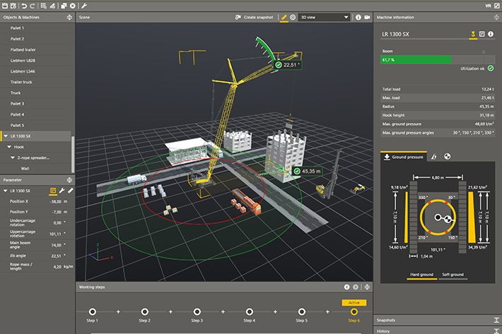 Die „Virtual Reality“ ist eine Erweiterung des bestehenden Crane Planner 2.0, mit dessen Hilfe das geplante Projekt inklusive Kran, Last und Umgebung im virtuellen 3D-Raum erlebbar gemacht wird. Am Planungstisch kann die gesamte Baustelle überblickt werden, die Maschinen können bewegt und die geplanten Arbeitsschritte vom Aufnehmen bis zum Absetzen der Last unmittelbar mitverfolgt werden. Im „Ego-Modus“ bewegt sich der Betrachter frei im virtuellen Raum und kann das geplante Projekt aus allen Blickwinkeln betrachten. Dadurch wird ein ganz neues räumliches Verständnis der Baustelle und der technischen Zusammenhänge erreicht.