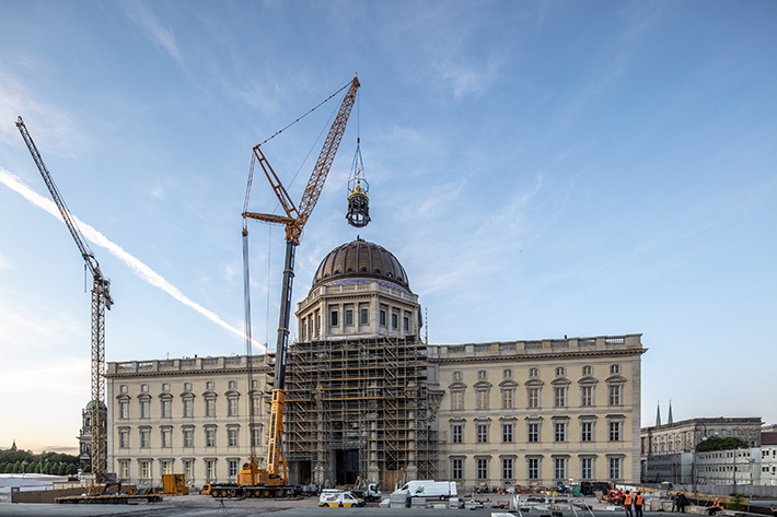 In Berlin-Mitte vollführte ein LTM 1500-8.1 der Firma Mobi-Hub einen Einsatz mit viel Publikum: Der Liebherr-Kran setzte die prächtige Kuppelkrone auf das neue Humboldt Forum. Acht Engelsfiguren und Palmblätter zieren die historisch rekonstruierte Kuppel mit Laterne und vergoldetem Kreuz. Mit dem Wiederaufbau des einst zerstörten Berliner Stadtschlosses soll das historische Berliner Stadtbild wiederhergestellt werden.