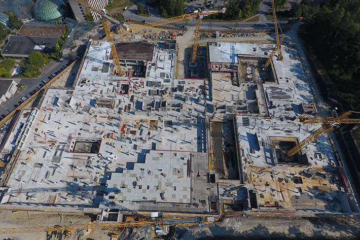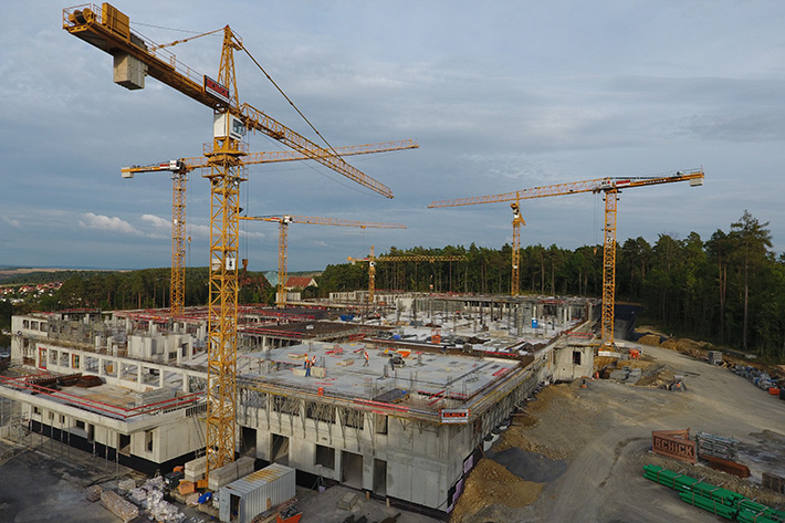 Sechs Liebherr-Obendreher sind derzeit beim Bau des neuen Rhön-Klinikum Campus in Bad Neustadt an der Saale im Einsatz. Das Großprojekt, das sich über eine Fläche von insgesamt 70.000 m² erstreckt, wird in insgesamt drei Bauabschnitten realisiert und soll 2019 fertiggestellt sein.