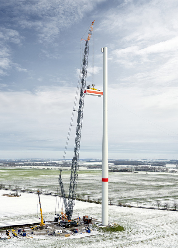 Die Spezialisten für die Errichtung von Windkraftanlagen an Land sind Mobil- und Raupenkrane, wie etwa der Gittermast-Mobilkran LG 1750. Bei seinem Einsatz im Nordosten Deutschlands errichtete er zwei Anlagen mit 170 Metern Nabenhöhe und besonders schweren Turmkomponenten von bis zu 120 Tonnen.