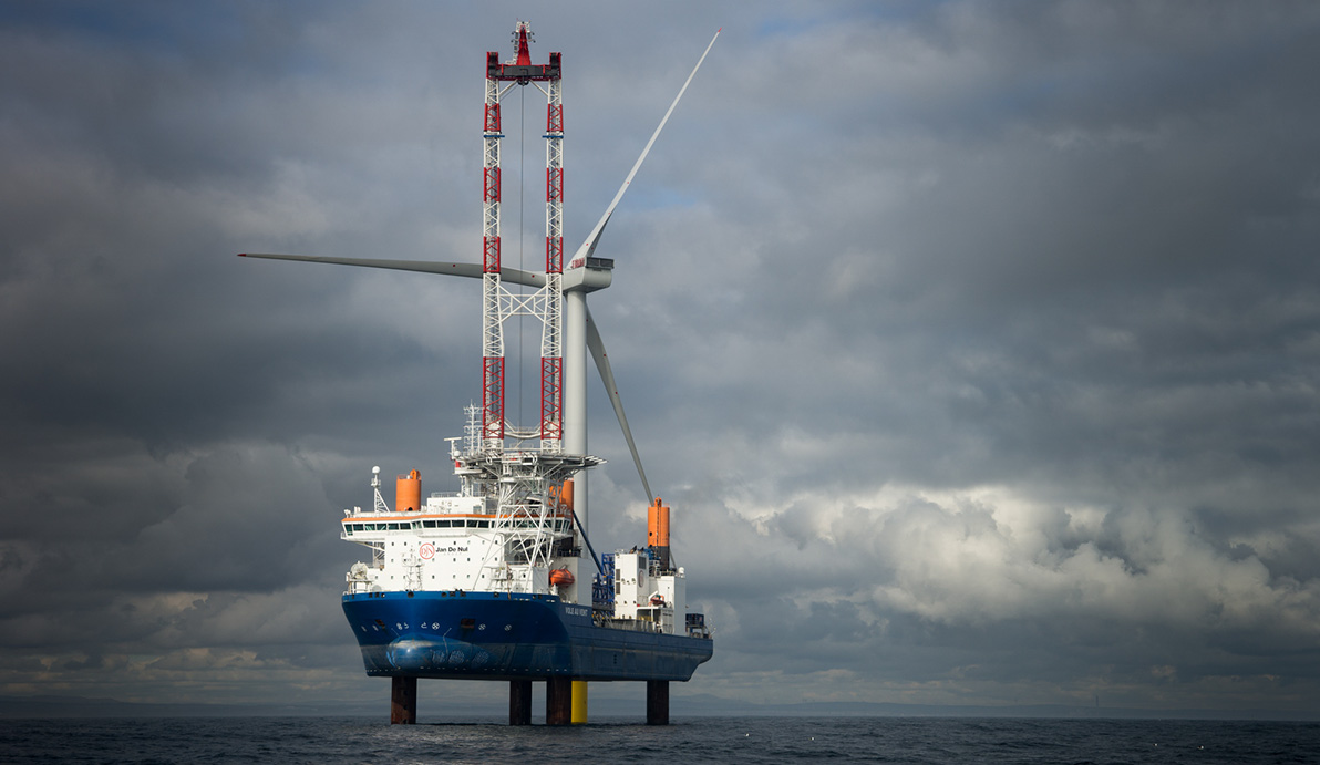 Durch die konstante Meeresbrise herrschen vor der Küste beste Bedingungen für Windparks. Doch das Meer birgt andere Herausforderungen: das unberechenbare, sich schnell verändernde Wetter und den Wellengang. Erbaut werden die Offshore-Windparks unter anderem mit Hilfe von Errichterschiffen, wie der Vole au Vent, die auf diesem Bild vor der Küste Taiwans im Einsatz ist. Mit an Bord: der Liebherr-Schwerlastkran CAL 45000.