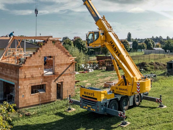 Not just in the old town of Prague are the Hanyš compact cranes from Liebherr needed. Here you can see an LTC 1050-3.1 erecting a roof truss in the outskirts of the capital.