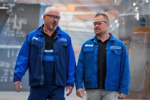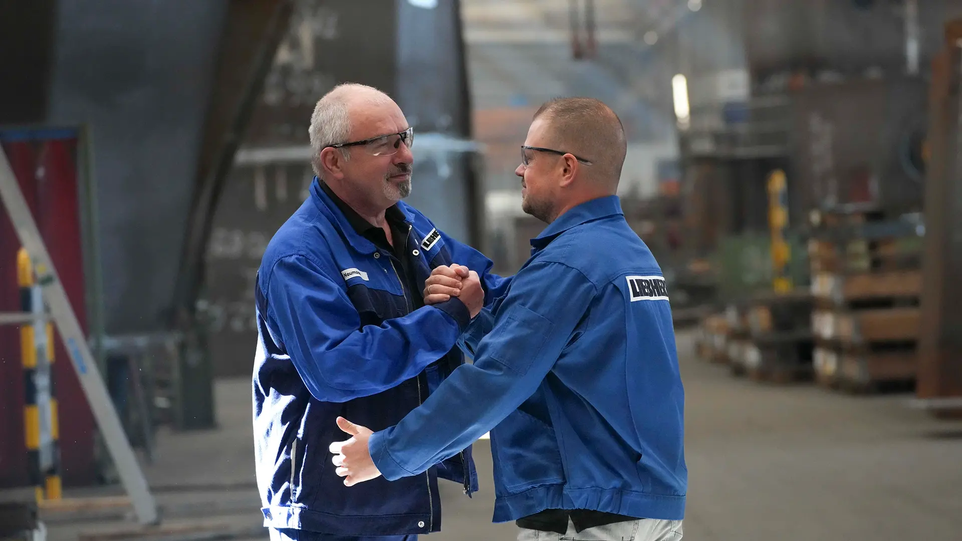 Jörg Neumann's professional career at Liebherr came to an end in October 2024, when he took his well-deserved retirement after 18 years. ‘What I will miss most is the team spirit and the many personal relationships that have grown here over the past few years. But I am sure that these will continue. Once you have yellow Liebherr blood in you, you will never let go of the company.’ One or two tears were shed on his last day. ‘We're both built close to the water anyway’, adds Maik. Just like the Liebherr maritime cranes on the quayside.