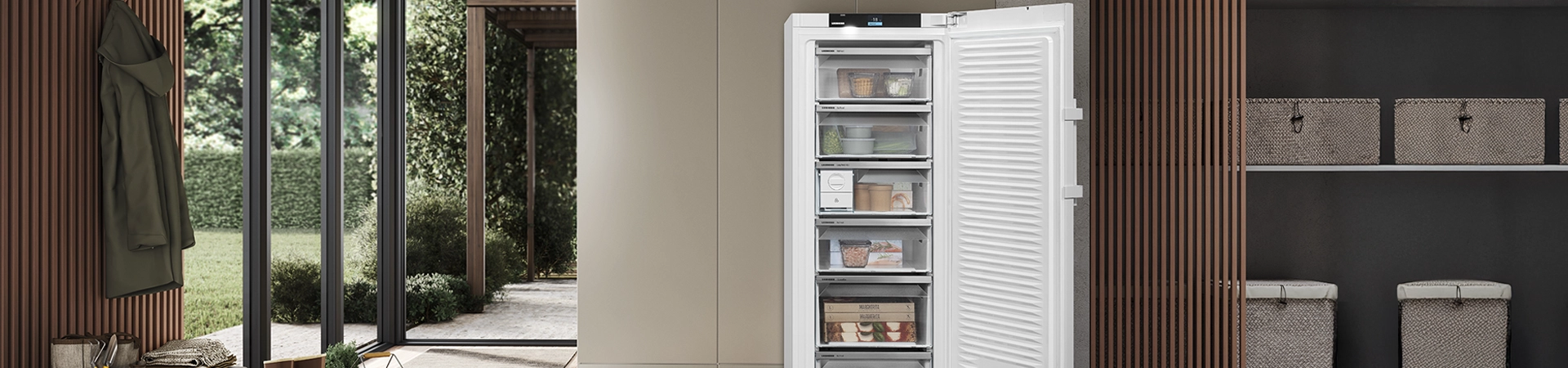 At Liebherr, you have the choice between fully integrated freezers and freestanding freezers. While fully integrated models fit seamlessly with your kitchen, freestanding freezers offer you the flexibility to place your appliance anywhere in your home. Whether you are looking for a small, space-saving freezer, a large freezer with more than three compartments, or even a freestanding chest freezer – we have a model to meet your needs.