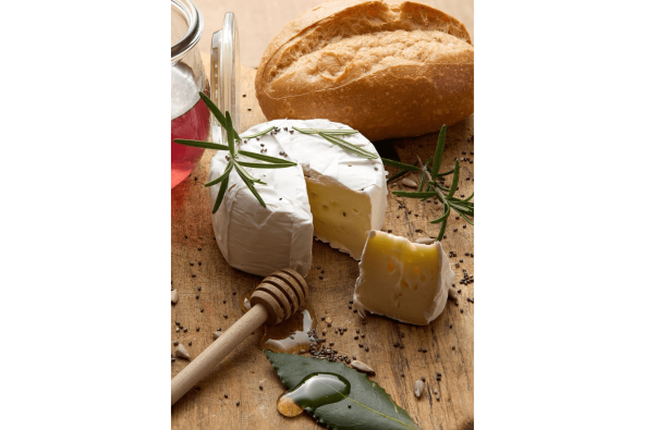 I score the top of the cheese, insert some slices of garlic clove, drizzle with honey, sprinkle with almond slivers and top with a sprig of rosemary. BOOM.