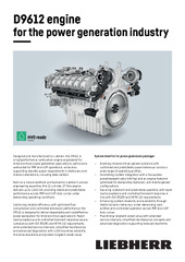 Designed and manufactured by Liebherr, the D9612 is a highperformance combustion engine engineered for missioncritical power generation applications, particularly wellsuited for PRP and COP operations, while also supporting standby power requirements in stationary and mobile installations, including data centers. Built on a robust platform and backed by Liebherr’s proven engineering expertise, this 12 cylinder, 27 litre engine delivers up to 1,100 kW, providing stable and predictable performance across PRP and COP duty cycles under demanding operating conditions. Combining reliable efficiency with optimised fuel consumption and controlled emissions performance, the D9612 is designed to deliver dependable and costeffective power generation for missioncritical applications. Rapid load acceptance and controlled transient response secure compliance with ISO 85285 and NFPA 110 requirements, while extended service intervals, simplified maintenance and advanced diagnostics with LiDIA maximise reliability, minimise downtime and protect longterm asset value.