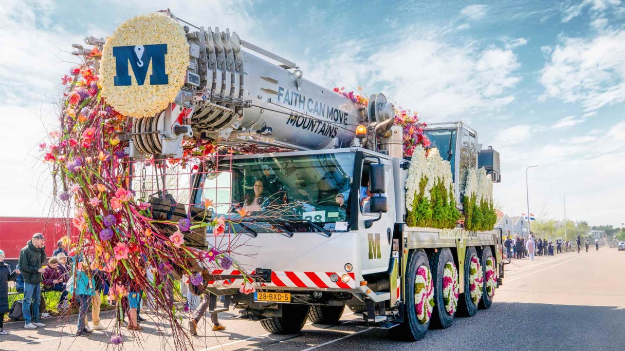 When spring arrives in Holland and the tulip fields are in full bloom, Haarlem – the city of flowers – becomes the venue for a spectacular spring festival. The highlight of the event is the 42-kilometre-long Bollenstreek flower parade. And right in the midst of it is an LTM 1070-4.2 from the US firm Mountain Crane Service. Inspired by a previous visit, Mountain Crane had the multi-tonne crane decked with fresh spring flowers – entirely in keeping with the motto “Faith Can Move Mountains”. The colourful crane drew admiring glances from far and wide, being awarded third place by the jury. It was an unforgettable appearance for the newly acquired crane before it began its journey across the Atlantic.