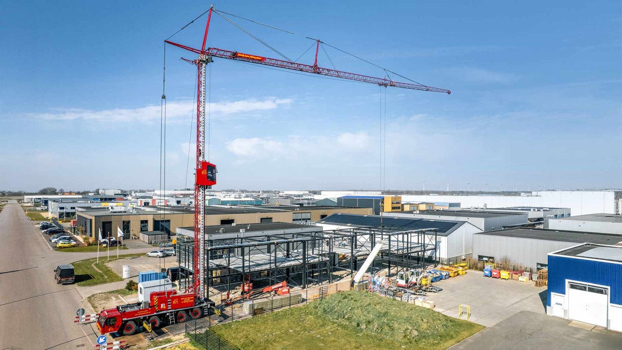 In the Dutch town of Urk, we discovered one of our mobile construction cranes working on a typical assembly job. After the completion of the steel construction, the walls had to be installed for the building of a hall. A Liebherr MK 88-4.1E from our partner Dick ten Klooster was holding a large section of wall on its hook. Thanks to its long boom, the modern mobile construction crane was able to carry out all of the work from just one spot. Even at its maximum radius of 45 metres, the machine – which can also be operated electrically – was still handling loads of up to 2.2 tonnes. The elevating cabin gives the crane operator the best view, ensuring superlative safety on the construction site.