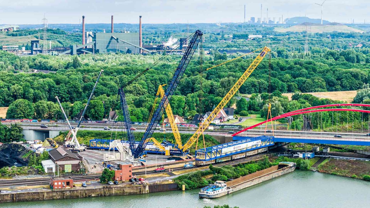 On the A42 near Bottrop, spectacular bridge work is being carried out as part of the road’s six-lane expansion. An old industrial bridge is being replaced by a new one with a broader span. Two LR 11000 crawler cranes from Liebherr are lifting a 220-tonne bridge section simultaneously and rotating it around 90 degrees. Quite a logistical challenge! The bridge section was transported via the Rhine-Herne Canal, although even the harbour basin needed to be deepened for this to happen. During the lifting operations, the canal is closed off so as to avoid wave movements caused by passing ships.
