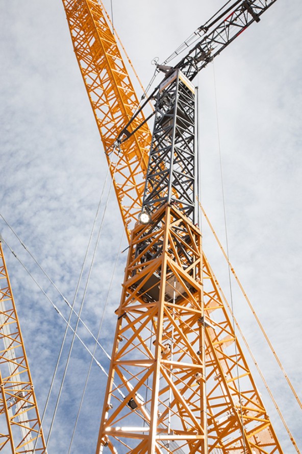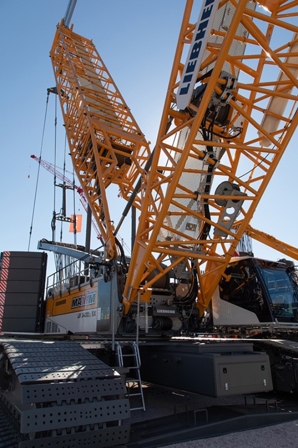 The LR 1400.1 SX crawler crane, equipped with derrick system and suspended counterweight, is specifically designed for demanding lifting operations and long boom configurations. The VarioTray allows flexible counterweight adjustment without requiring an auxiliary crane, while advanced assistance systems such as “Gradient Travel Aid” and “Boom Up-and-Down Assistant” provide optimal operational safety.