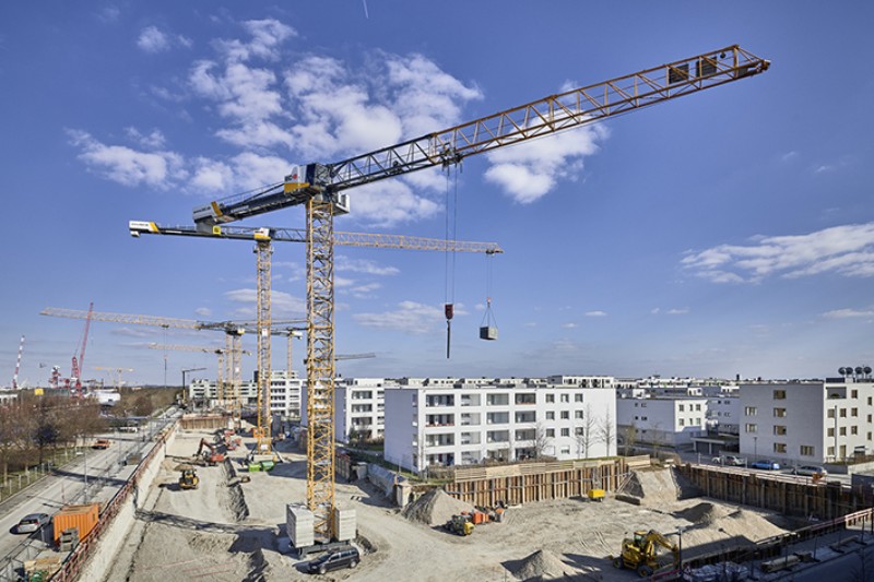 The six-storey timber construction will house around 160 apartments, communal and commercial space, a roof garden and its own underground car park in the immediate vicinity of the exhibition centre. Factors such as the size of the structure and the reliability of Liebherr tower cranes contributed to the building contractor Xaver Riebel Bauunternehmung GmbH & Co.KG deciding in favour of the three new EC-B cranes from crane leasing company BKL Baukran Logistik GmbH. In addition, these new top-slewing cranes have a particularly small footprint and hoist performance can easily be reduced by up to 50 percent – a big advantage for this inner-city operation.