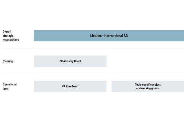 An organisational structure was established for the management and monitoring of sustainability-related issues. Strategic overall responsibility for corporate responsibility (CR) lies with the Liebherr-International AG holding company, whose administrative board represents the highest decision-making body. It is made up solely of members of the Liebherr family. The CR Advisory Board is the highest internal advisory body. Its members include the executive board of Liebherr-International AG, the managing directors of the divisional controlling companies as well as the representatives of the relevant group functions. At operational level, the CR Core Team is the work and exchange platform for all CR managers in the product segments as well as in the central departments concerned. In addition, subject-specific project groups and expert groups, whose members are experienced specialists, develop important CR-related issues and measures and are available to provide advice. Due to the wide range of external and internal requirements to which the Group is subject in this topic area, the Group therefore started to analyse improvements in its current CR organisation during the business year. Initial changes are expected to be implemented from 2026.
