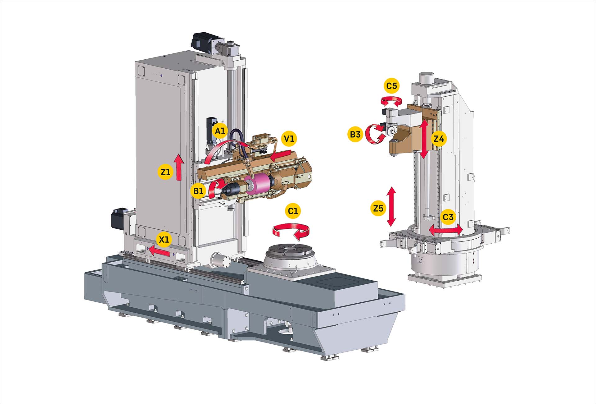 A1 - swivel movement of tool | B1 rotary movement of tool | B3 - dressing tool axis | C1 - table axis | C3 - rotary movement of ringloader | C5 - dresser swivel axis | V1 - tangential movement of tool | X1 - radial movement of machine column | Z1 - axial movement of tool | Z4 - vertical motion of tailstock | Z5 - vertical motion of ringloader