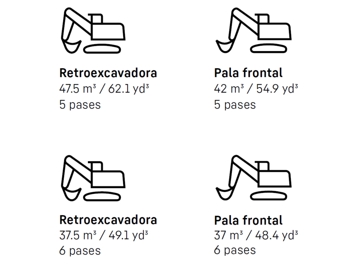 *Factores específicos del sitio como la densidad de los materiales sueltos, el tamaño del balde de extracción, los factores de llenado, tamaño de la tolva del camión y la capacidad de carga útil, influirán en en la coincidencia de ciclos. Contacte a su empresa local de ventas y servicio Liebherr o su socio de ventas para el análisis de su sitio
