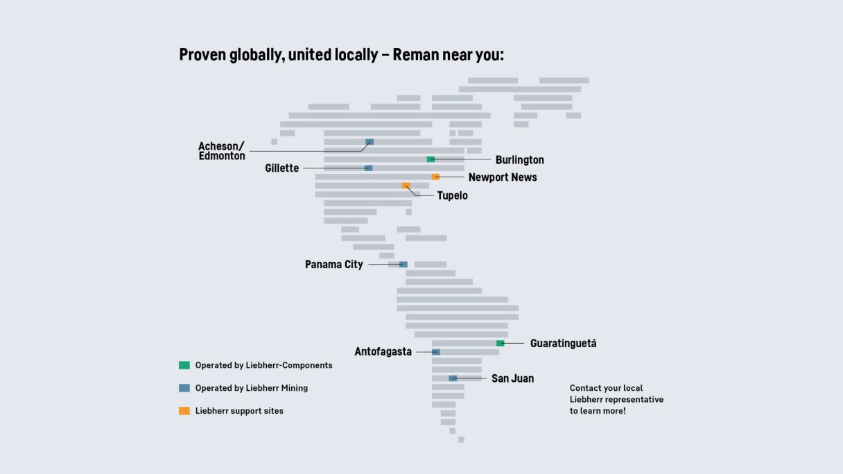 Con 15 centros en todo el mundo, Liebherr ha ampliado continuamente el programa Reman a nivel mundial. En 2015, Liebherr Canada Ltd. se unió oficialmente al programa de remanufacturación proporcionando las mismas soluciones sostenibles para Norteamérica. Al ofrecer una coordinación de servicio de principio a fin dentro de la región, los clientes de Canadá, Estados Unidos y México pueden beneficiarse de opciones rentables y eficientes en tiempo para dar servicio completo a sus equipos. Liebherr también está estableciendo un nuevo almacén en Tupelo, MS, para optimizar la disponibilidad de piezas, proporcionar un servicio al cliente de alta calidad y servir como centro de distribución para las Américas.