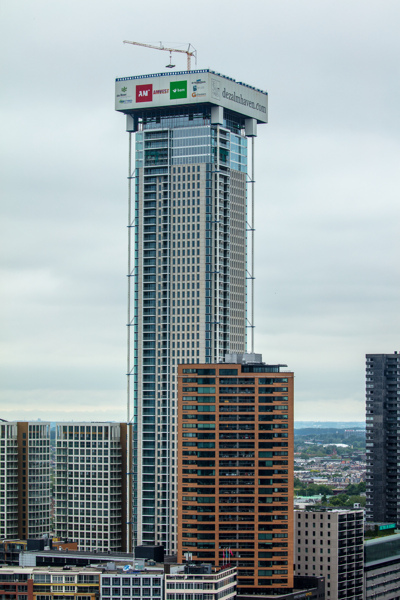 La grúa ya ha sido utilizada una primera vez. En esa ocasión llevó al límite a su capacidad de carga máxima de cuatro toneladas elevando aproximadamente cuatro toneladas de pesados elementos de escalera durante un montaje en la comuna suiza de Giswil en el cantón de Obwalden, lo cual es una aplicación típica de la grúa automontable 34 K de Liebherr, utilizada principalmente en la construcción de viviendas. Gracias a su enorme flexibilidad cubre una gran variedad de aplicaciones: de la vivienda unifamiliar a villas exclusivas, pasando por viviendas multifamiliares. También se puede encontrar esta grúa en la construcción de naves industriales o en proyectos de infraestructuras. Con su altura bajo gancho de hasta 26 metros es muy adecuada para proyectos en edificios de hasta 20 metros de altura. Una 34 K tuvo una utilización algo inusual hasta mediados de julio en el edificio más alto de los países del Benelux.