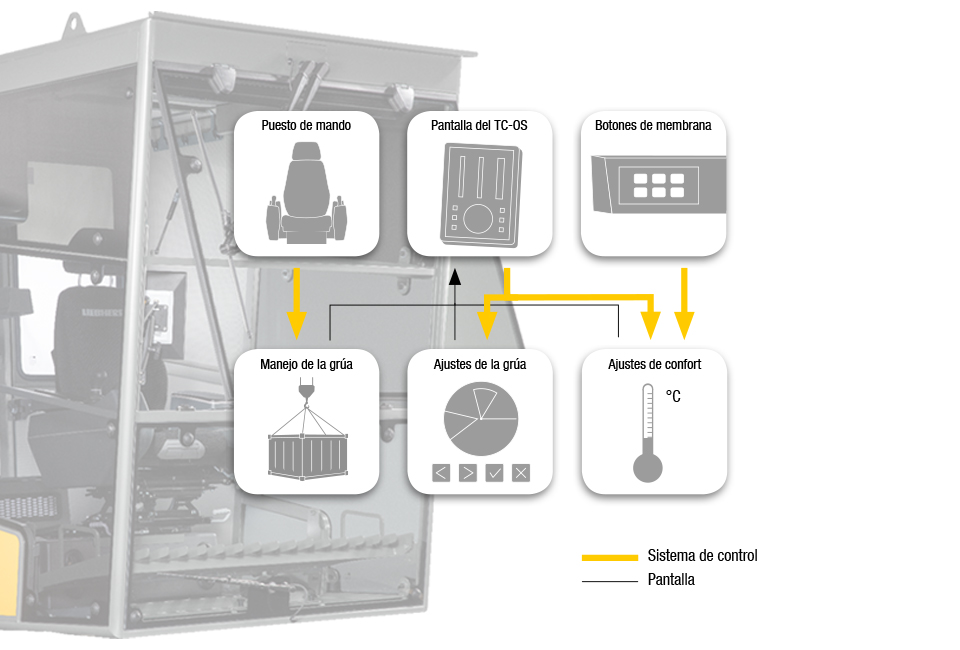 Una buena visibilidad en la cabina no depende solo de un amplia área de visualización, sino también de una capacidad de manejo lógica y sencilla. La grúa opera mediante combinadores, y los ajustes de la cabina (p. ej. calefacción/aire acondicionado, limpiaparabrisas) mediante botones de membrana robustos y de fácil acceso. Todos los ajustes son coordinados por la pantalla multitáctil central y todo está conectado en red para que cada elemento de control muestre la misma información en todo momento.