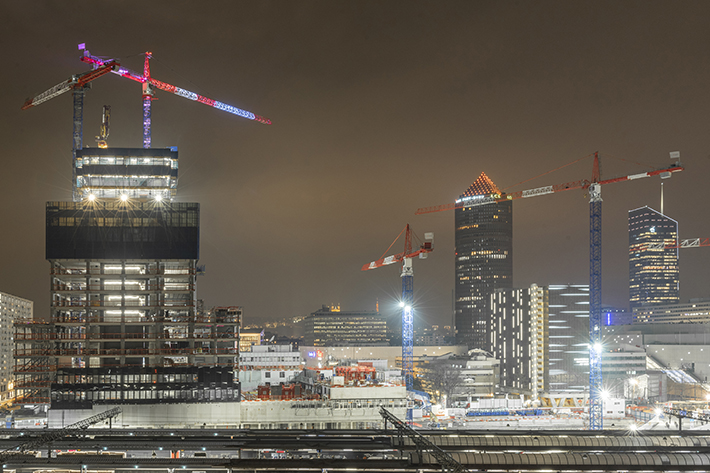 Las grúas utilizadas para el proyecto directamente en la estación de Lyon son la 420 EC-H 16, la 280 EC-H 12, la 280 EC-H 16 y la 250 EC-B 12. El edificio más llamativo de la remodelación de Part-Dieu es el "To-Lyon", un rascacielos de 170 metros de altura. Cuando esté terminado, el edificio ofrecerá una superficie total de 80.000 metros cuadrados que albergará oficinas, tiendas y un hotel. Nuevos edificios, más espacio para la naturaleza y movilidad en red: entre otras cosas, estas medidas pretenden hacer el distrito aún más atractivo para residentes y visitantes.