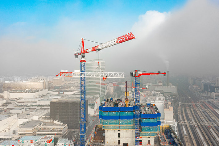 Un edificio de 170 metros de altura, poco espacio y pesados ascensores: Cuatro grúas torre de Liebherr, pintadas para advertencia de vuelo, contribuyen a la remodelación del distrito Part-Dieu de Lyon, en Francia. Para este encargo del cliente Vinci Construction France se ha prestado especial atención a una gran capacidad de carga y a un concepto óptimo de anclaje de las grúas. Liebherr ha desarrollado soluciones a medida para estos requisitos.