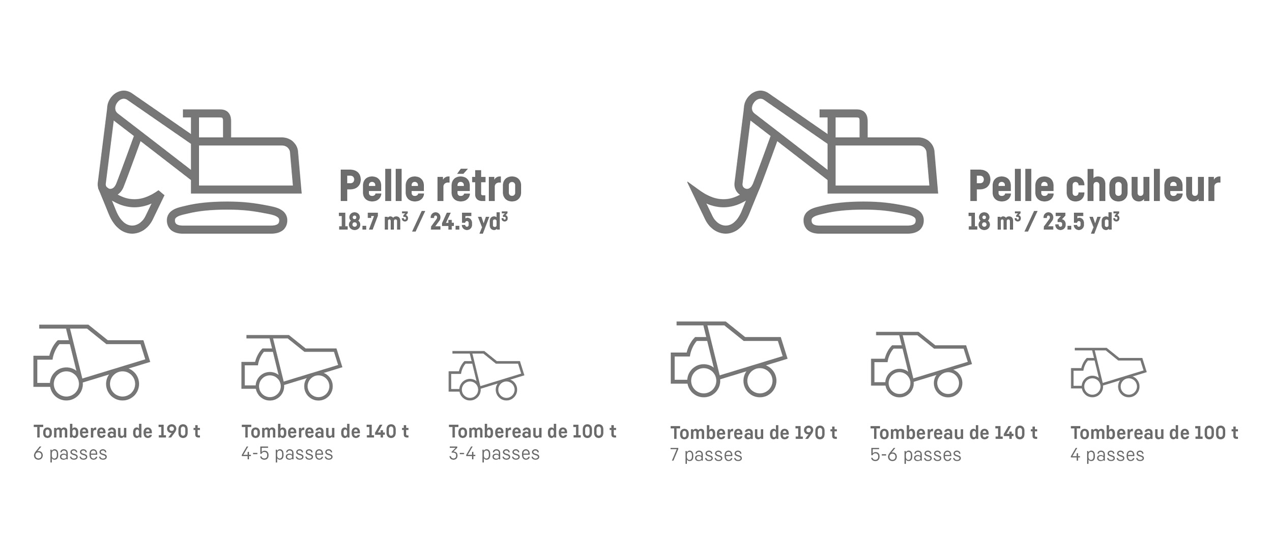 *Des facteurs spécifiques au site, tels que la densité des matériaux en vrac, la taille du godet, les facteurs de remplissage, la taille de la benne du camion et la capacité de charge utile, influenceront la correspondance des passes. Contactez votre société de vente et de service Liebherr ou votre partenaire commercial pour une analyse de votre site.