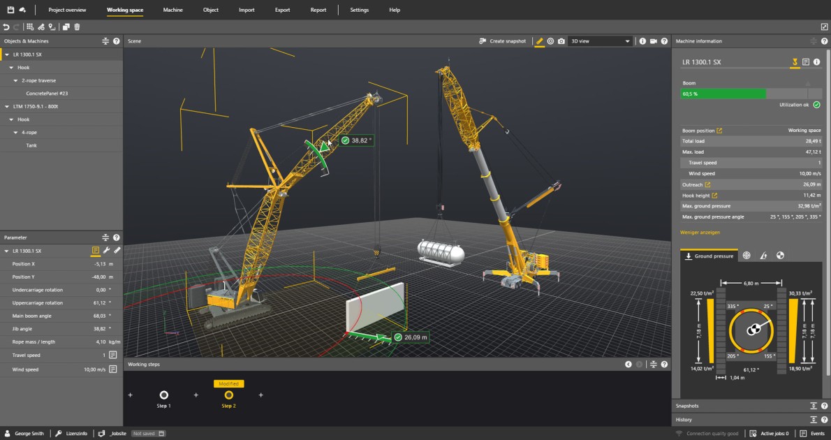La planification d'une opération de levage de fort tonnage est une tâche difficile. Toutefois, même les opérations de levage supposées simples des grues mobiles et sur chenilles peuvent être plus compliquées qu'on ne le pensait au départ. Le Crane Planner 2.0 vous aide à envisager toutes les éventualités et à trouver des solutions à l'avance afin que vous puissiez maîtriser votre opération de levage de la meilleure façon possible.