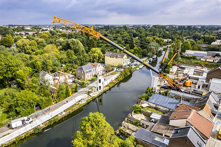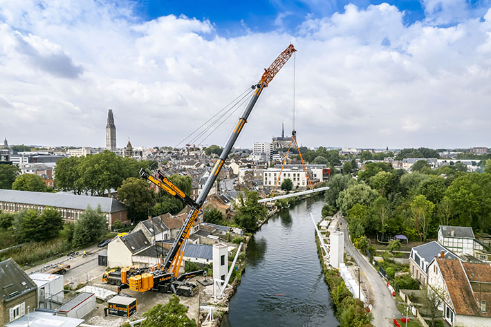 La surface disponible pour le montage de la grande grue était très réduite. Des procédures de préparation intelligentes, une bonne planification et une bonne coordination au sein de l'équipe ainsi que l'assistance d'une grue télescopique sur chenilles LTR 1060 de Liebherr ont permis de monter la grue lourde sans problème. C'est ainsi que la grue Liebherr s'est finalement retrouvée avec 154 tonnes de contrepoids et une fléchette fixe de 13 mètres de long, prête à tirer, à côté d’un bras de la Somme dans le magnifique quartier des Hortillonages d'Amiens, sur laquelle passera la nouvelle passerelle.