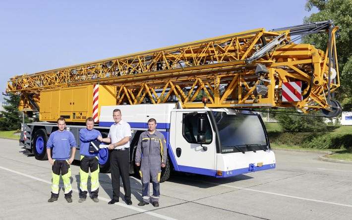En septembre, la société Liebherr-Baumaschinen AG à Reiden a remis une nouvelle grue mobile MK 88. Le chef d'entreprise Hans Peter Baumann, accompagné de son fils Rico, est venu chercher sa grue MK 88 flambant neuve. La MK 88 va ainsi permettre à l'entreprise Baumann Kran AG d'élargir considérablement sa gamme de prestations de services.
