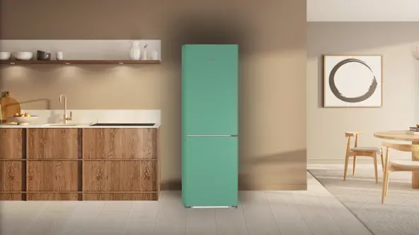 3. Eksperimentirajte s komplementarnim bojama i istaknite svoj dizajnerski hladnjak kao središnju točku u prostoru. Komplementarne boje, koje se nalaze na suprotnim stranama kola boja, naročito su privlačne ljudskom oku. Tako, primjerice, naša boja LovelyRose koja je sada u trendu predstavlja elegantan kontrast u odnosu na nježno zelenu pozadinu.