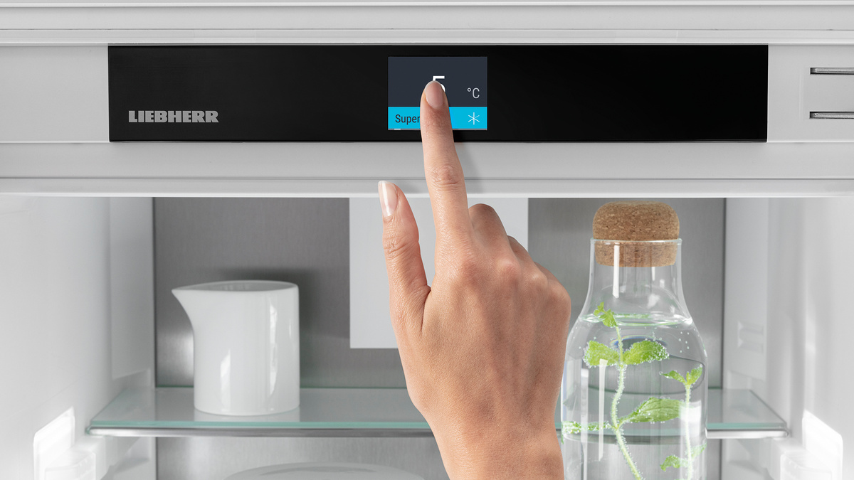 Користете ги само врвовите на прстите и Liebherr ќе ги исполни вашите команди: Благодарение на екранот на допир и лизгање, лесно и интуитивно ќе управувате со вашиот фрижидер. Одберете функција на екранот во боја, како што е „SuperCool“, само со допирање и лизгање. Исто толку лесно е регулирањето на температурата. Што кога не го користите екранот? Тогаш ви ја покажува реалната температура.