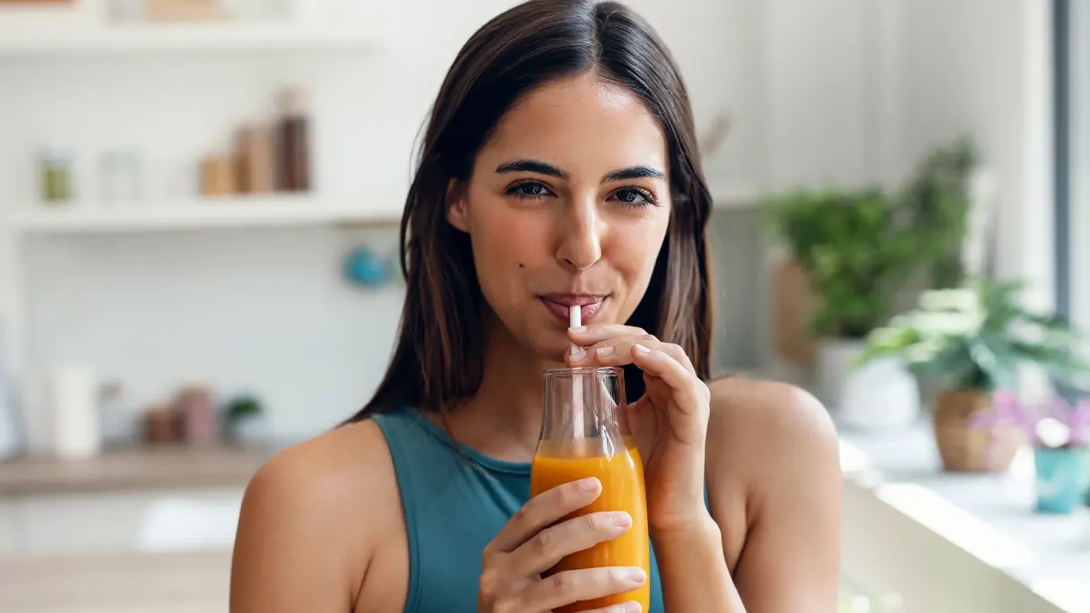 Vruchtensap kan in uitzonderlijke gevallen een portie fruit vervangen, maar het bevat heel weinig vezels, die essentieel zijn voor een vol gevoel en een stabiele spijsvertering. In plaats daarvan drijft het hoge suikergehaltede energie- en bloedsuikerspiegel snel op. Hele vruchten zijn daarom een betere keuze als tussendoortje of als onderdeel van een maaltijd.