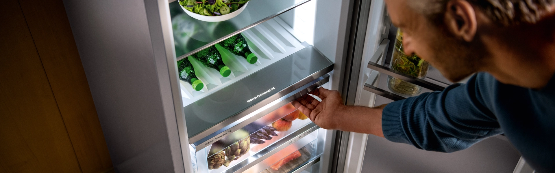 Завжди намагайтеся зберігати кожну групу продуктів у визначеному місці. Сортуйте продукти відповідно до умов зберігання. Кожна модель холодильника має різні температурні зони, залежно від його конструкції та віку. Холодильник Liebherr із сейфом BioFresh, який забезпечує оптимальні умови зберігання (вологість і температуру) для фруктів і овочів, а також молока і м'яса, відрізняється від холодильника без технології збереження свіжості. Детальніше про умови зберігання та інфографіку ви знайдете тут: покладіть речі в правильне місце. Насолоджуйтесь довше.