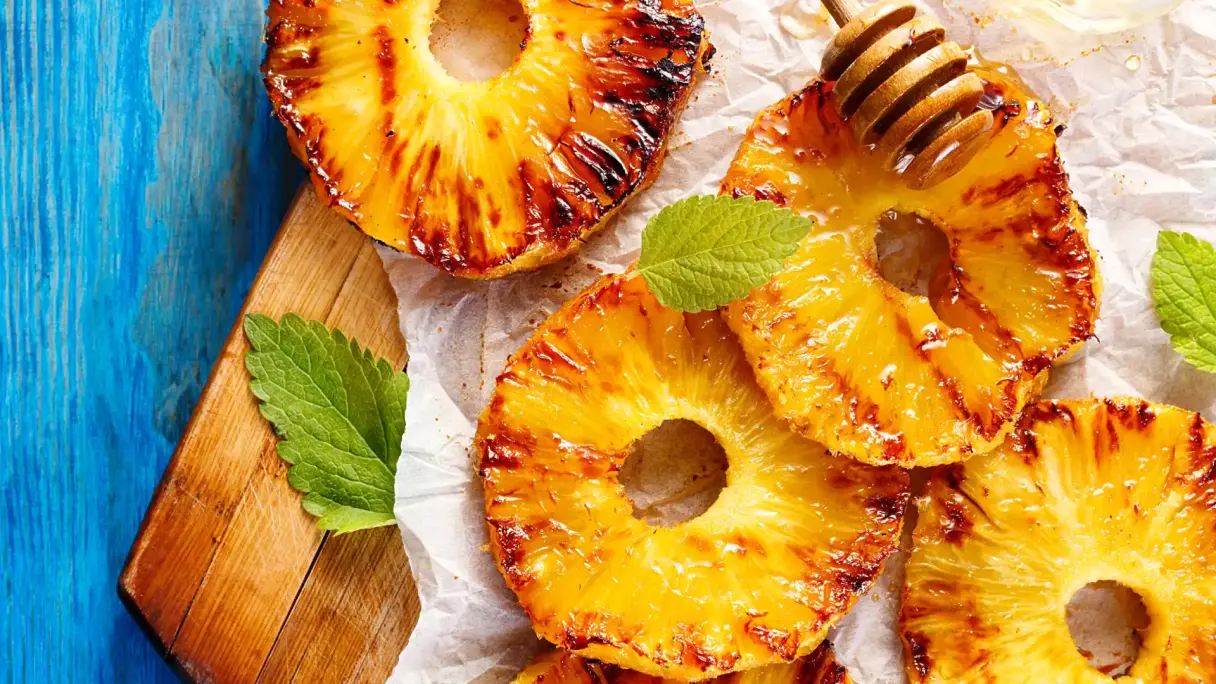 Ананас: ананас - це також простий десерт, який можна приготувати на барбекю, якщо нарізати його тонкими смужками або кільцями. Подається зі свіжим йогуртом, трохи м'яти та фісташковими горішками, що створює ідеальну родзинку.