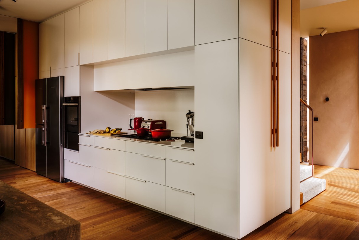 Haberfield廚房獨具匠心的挑高設計,確保充足自然光線,使廚房明亮通風。利勃嵌入式冰箱和冷凍櫃完美隱匿于飾面之後,