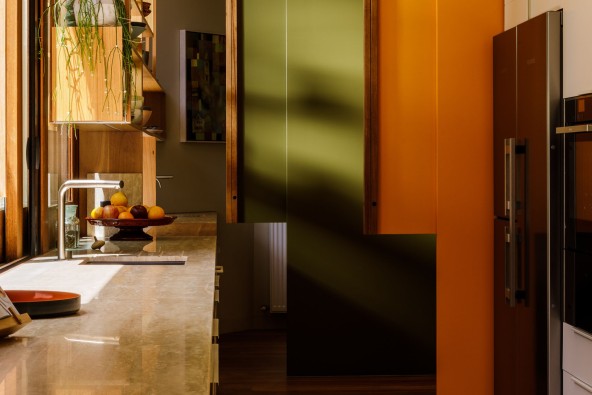在這間翻新的家庭廚房中,利勃Monolith系列的冰箱、冷凍櫃和酒櫃完美整合,與櫥櫃無縫嵌合,形成一體化設計。