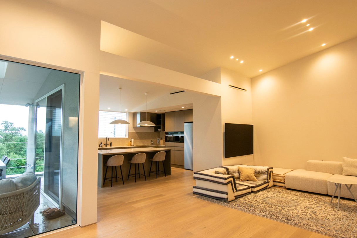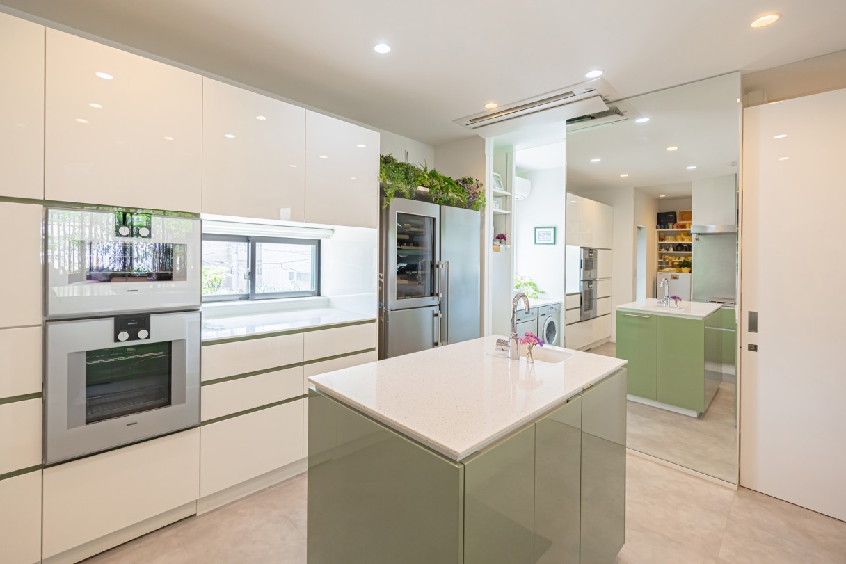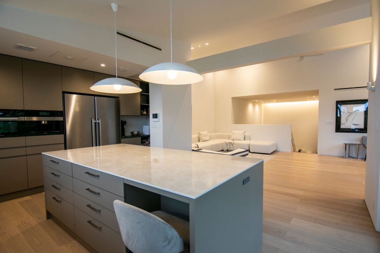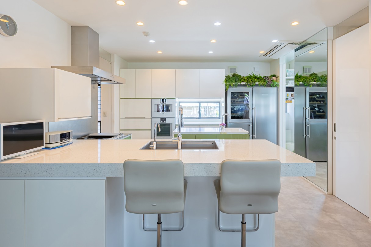 廚房區域採用全嵌入式設計,將所有廚電隱藏於檯面下方,呈現簡潔流暢的視覺效果。谷尻誠特別選用利勃嵌入式冰箱、冷凍櫃及酒櫃,並為冷藏設備訂製木質門板,實現渾然一體的空間質感。